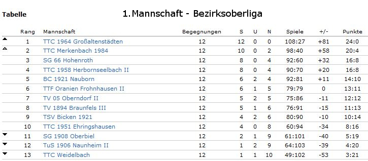 Die 1.Mannschaft ist nach dem Abstieg letzte Saison wieder voll auf Kurs „Bezirksoberliga“. Mit 24:0 Punkten steht man souverän vier Punkte vor Verfolger Merkenbach, gegen die es das einzig knappe Ergebnis (9:6) gab. Ausserdem ist man im Pokal im Viertelfinale und trifft dort auf Eisenbach.