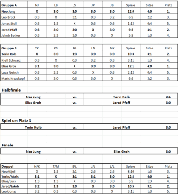 Auch die zugeloste Doppelkonkurrenz bot zahlreiche spannende Begegnungen, in denen jedes Doppel mindestens einen Sieg feiern konnte. Ungeschlagen blieben jedoch Torin Kolb und Maris Krauskopf, die sich den ersten Platz vor Jared Pfaff und Jakob Becker sicherten.