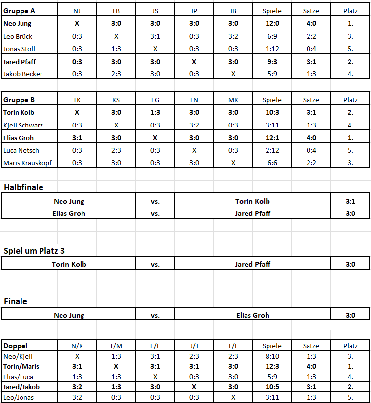 Nach längerer Pause konnte beim TTC wieder eine Vereinsmeisterschaft mit zehn Teilnehmern ausgetragen werden. Die engagierte Nachwuchsarbeit zeigt dabei deutlich Wirkung, spricht sich zunehmend herum und lässt auf weitere Talente in der Halle hoffen.